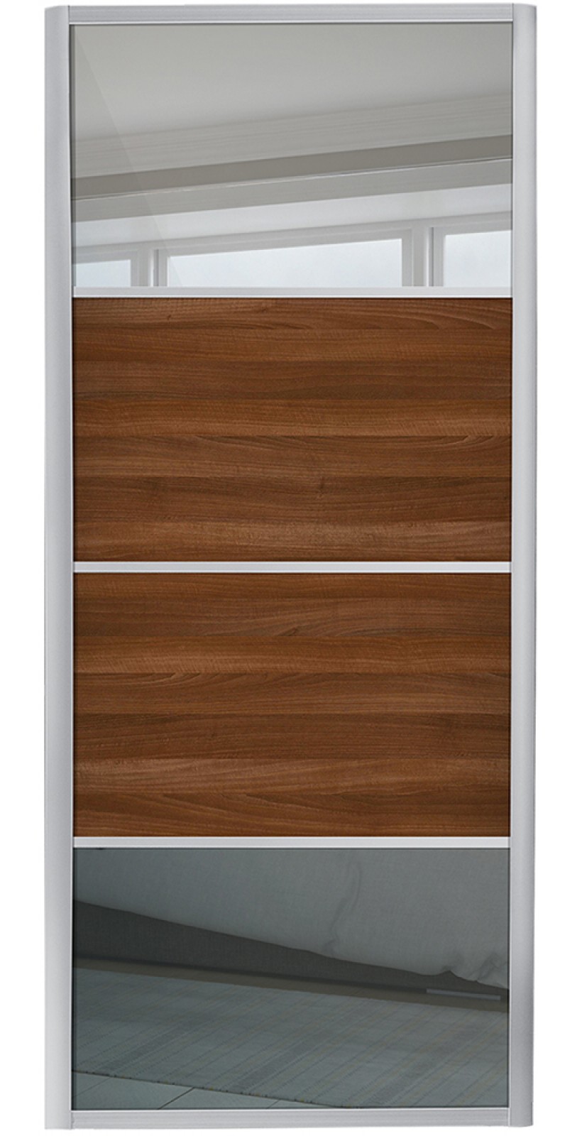 Four panel mirror walnut wardrobe door from our Ellipse range.