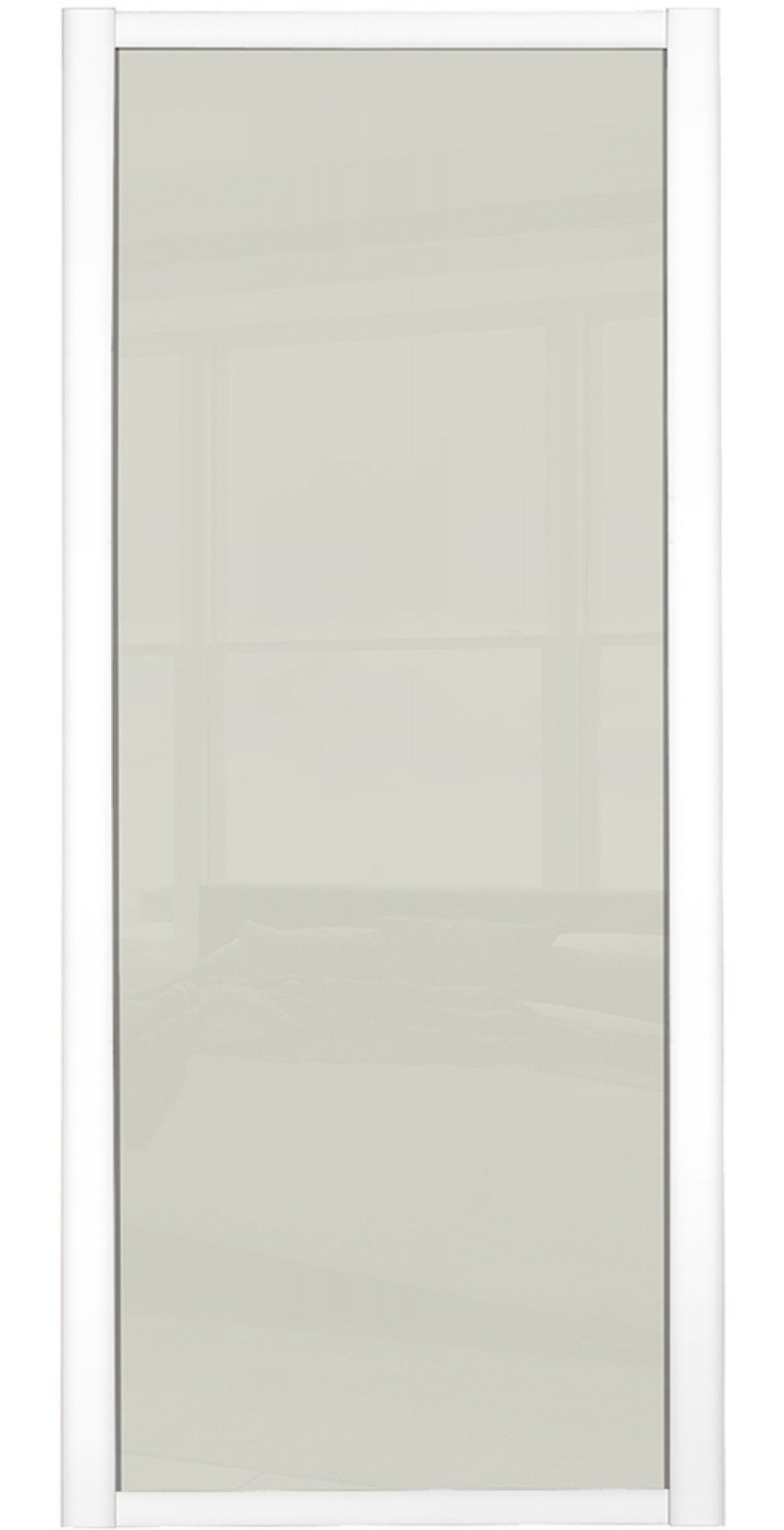 Single panel arctic white glass wardrobe door with white frame from our Shaker range.