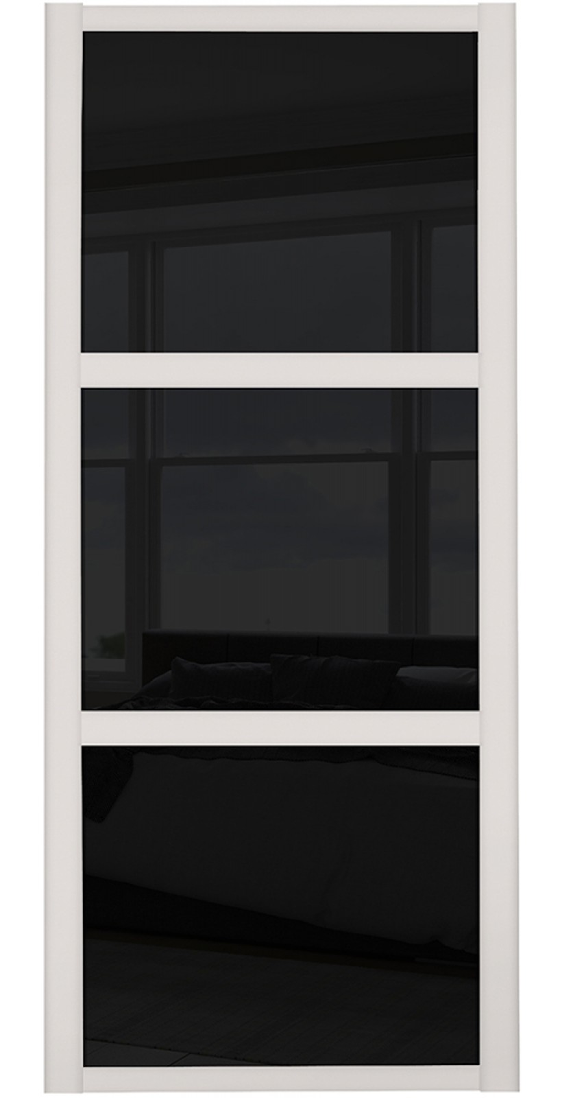 Three panel black glass wardrobe door with cashmere frame from our Shaker range.