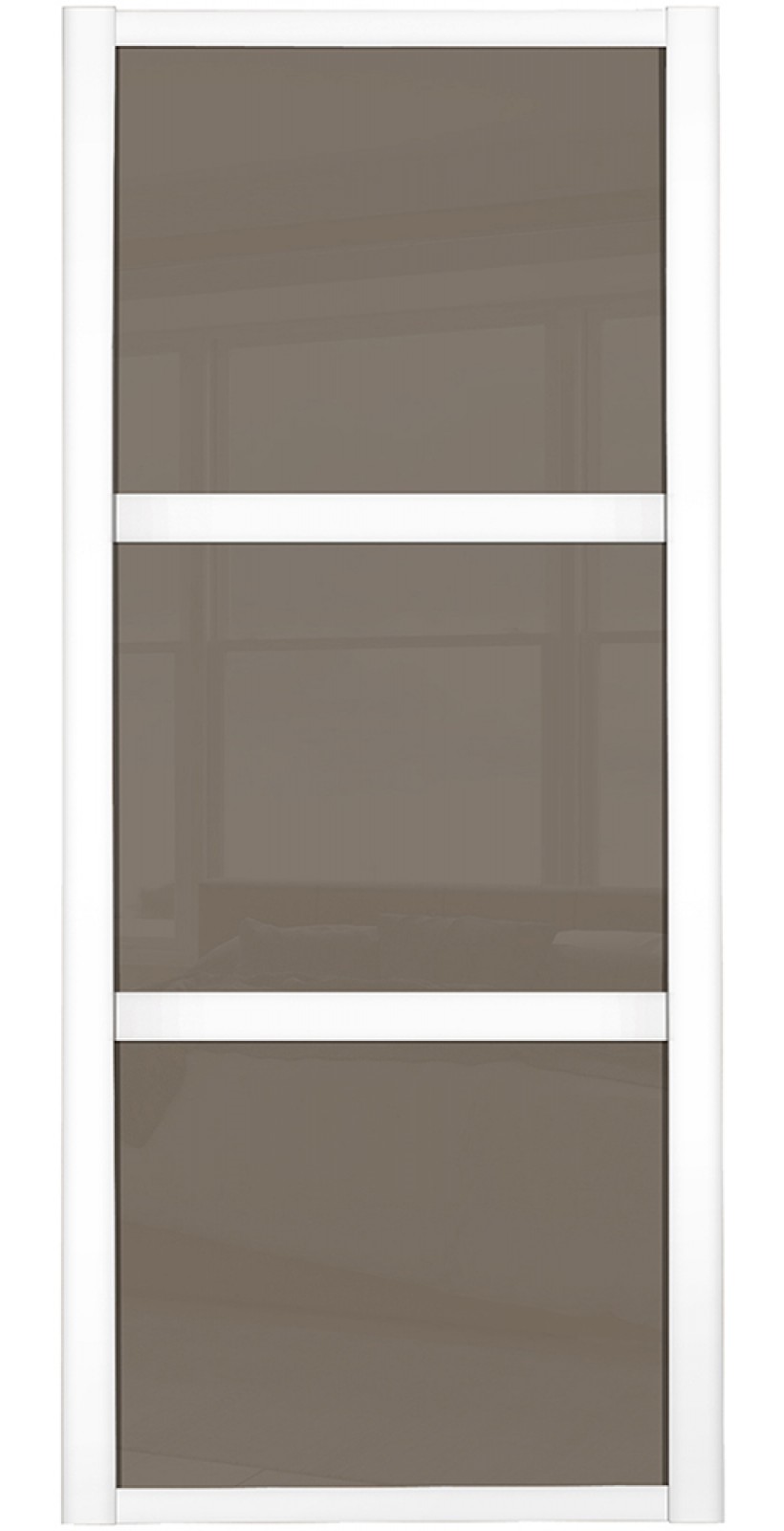 Three panel cappuccino glass wardrobe door with white frame from our Shaker range.