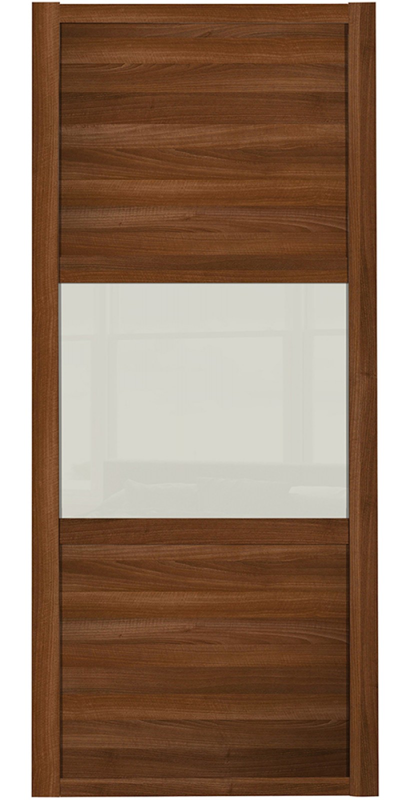 Three panel walnut arctic white glass wardrobe door with walnut frame from our Shaker range.